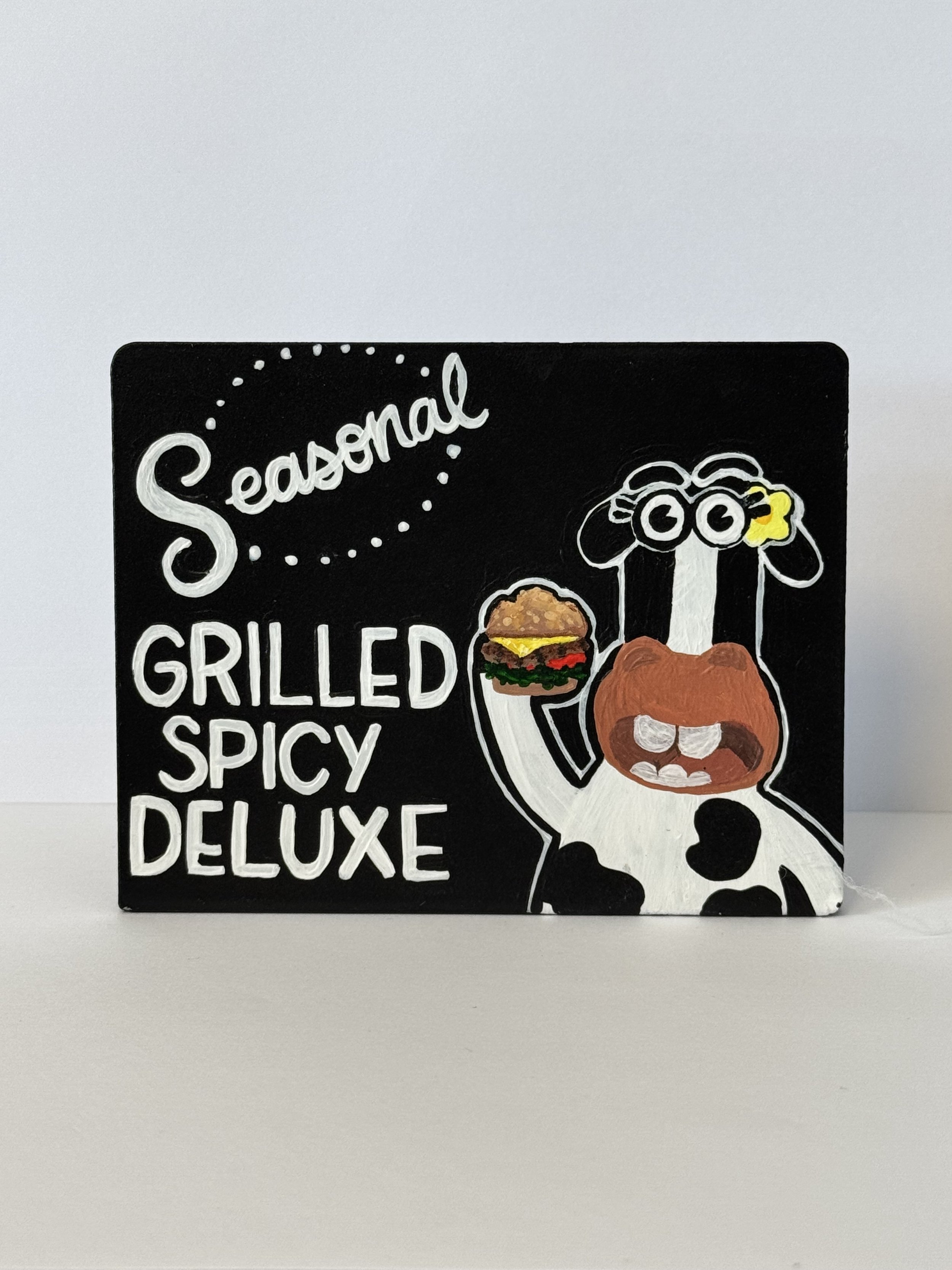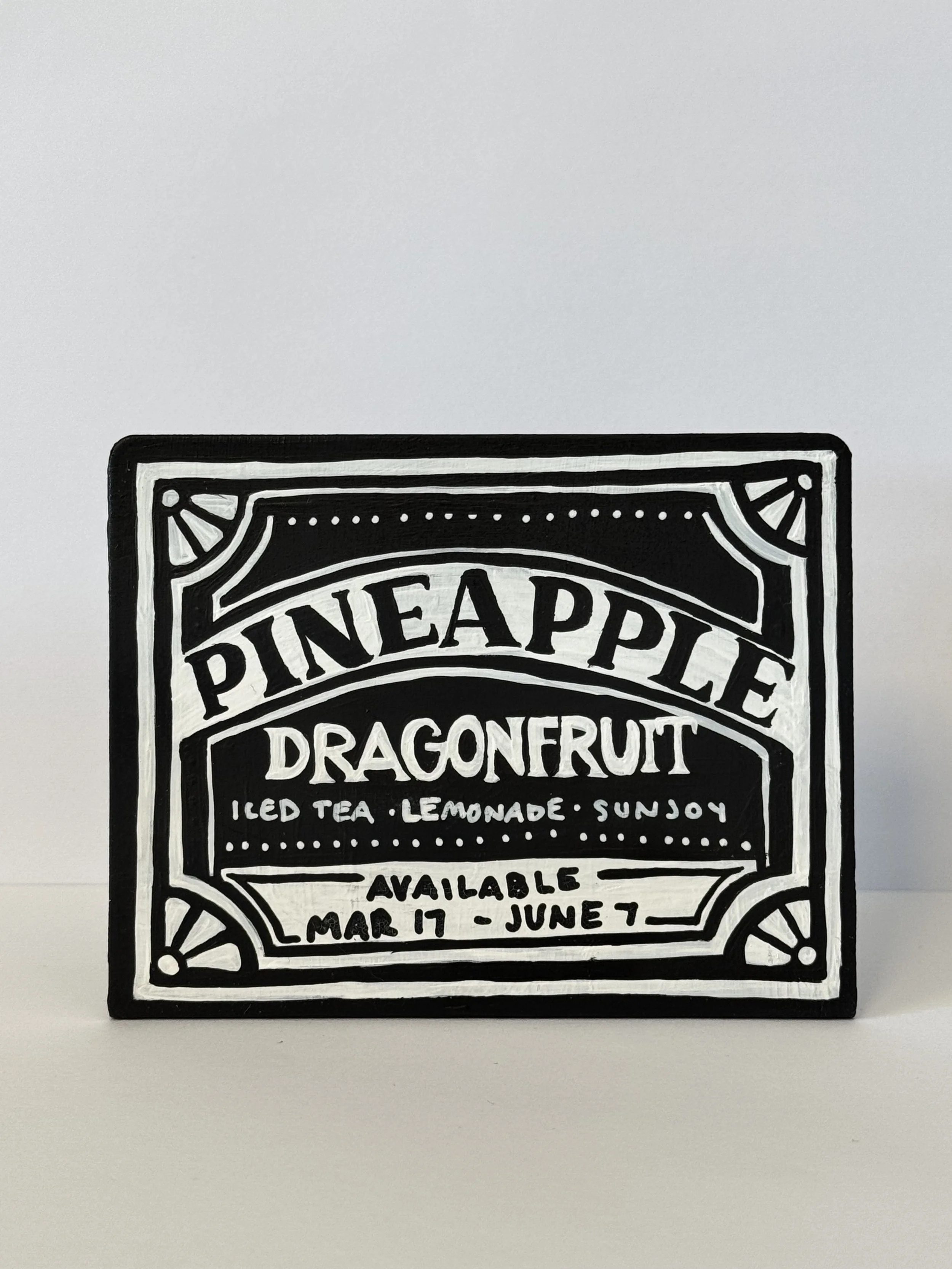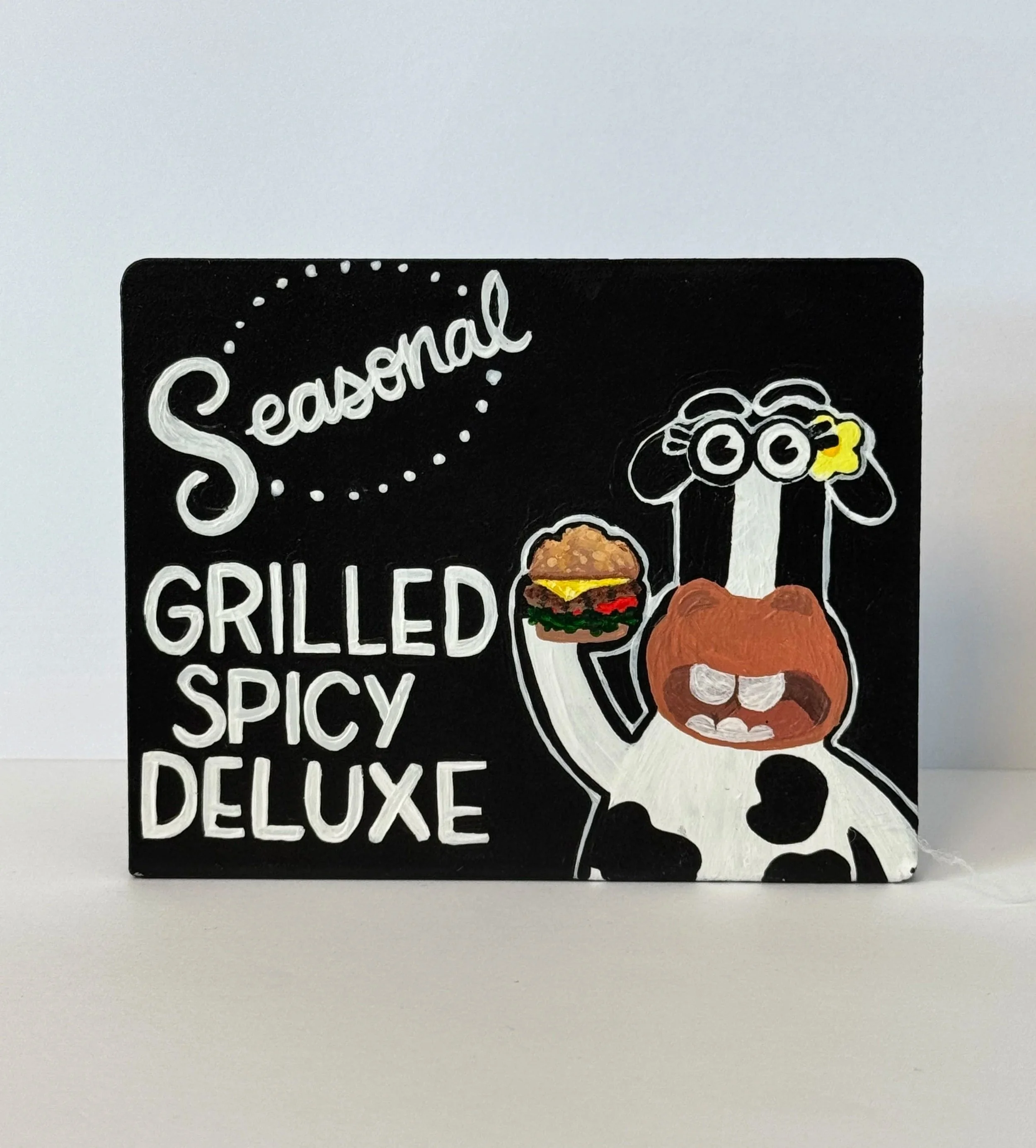 We see each table as a space to add a little bit of home. There are nineteen tables in our restaurant that are lined with a vase of fresh flowers and a Sincerely, Sterling original painting. I use the 2in by 3in signs to create little artworks that promote the current seasonal items.